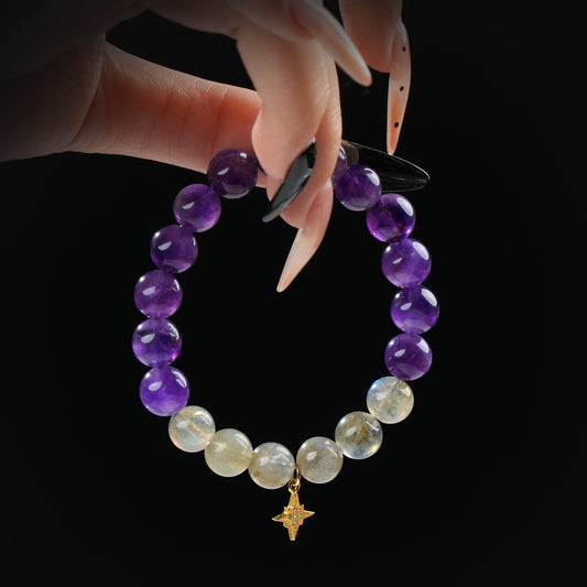 Gray Moonstone & Amethyst Bracelet – Intuition, Emotional Balance & Inner Peace